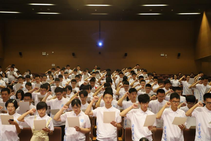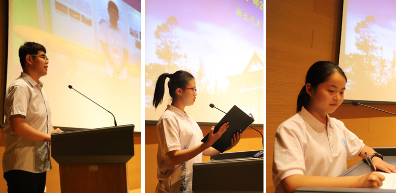 求是英才班张天依同学代表新生发言。她列举了天津大学校史上优秀校友和科研成果,并与全体新生共勉:传承天大的实事求是的校训,开拓创新的科研精神,追求天大理想,谱写天大未来。郑一玮同学带领全体新生宣读《求是学部荣誉誓词》,在课程学习、学术研究、生活工作方面尽己所能做到“追求卓越、求是创新”。同学们举起右拳,庄严宣誓,向自己的未来做出最郑重的承诺,并签署荣誉誓词。