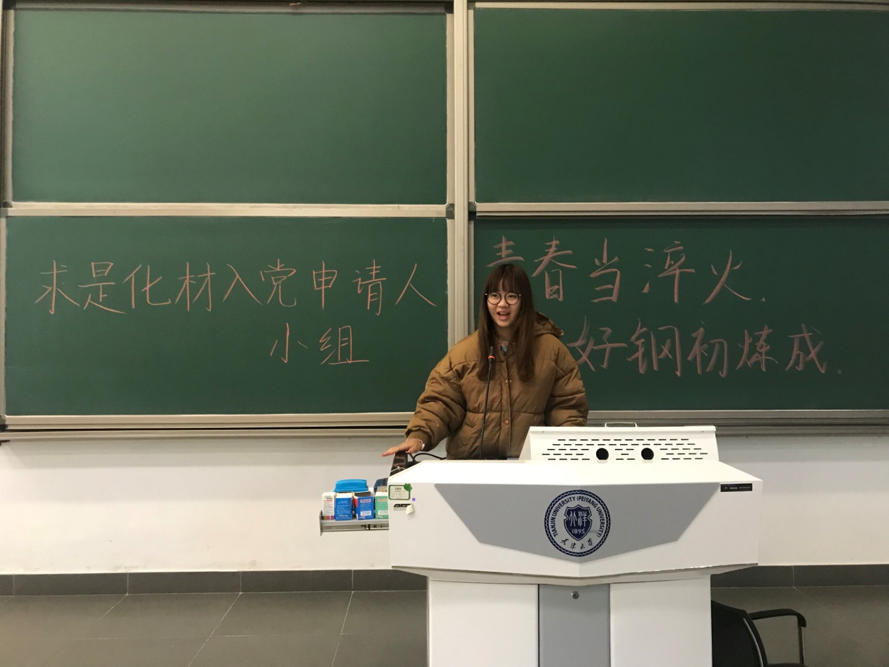 2017级化工材料入党申请人学习小组在46教A120开展了以“青春当淬火,好钢初炼成”为主题的学习活动,化材申请人小组16人参加了本次学习活动。学习小组组长张特强调了各位申请人应该增强自己内心的责任感与荣誉感,振奋自己爱国报国的激情,推动自己开拓进取、不断创新、超越自我、奋勇争先,为实现强国梦、强军梦贡献力量。冯涵同学讲述了把青春梦融入参军梦,于大学生而言,是一项光荣而有意义的事。在军旅生活中,大学生不仅可以强健体魄、磨炼意志,更重要的是,它会锤炼自己过硬的本领。刘琳同学阐述了“青年勇担当,青春砥砺行。习近平在与南开大学8名入伍大学生的回信中,深切寄托了对青年学子应当心怀家国情怀,努力奋斗的希望。这不仅激励着我在入党人学习小组中积极学习理论知识和实践能力,提高思想水平,更让我感受到青年的使命之重,任重而道远,努力奋斗才能为国家作出贡献!” 黄北辰说,“他们来到大江南北的军营之中,不断地严格要求自己,比如认真进行战术训练,认真学习理论知识,认真磨练装备技术,在比赛中,评比中处处争先,入伍一年已经有了一些成绩,我打心眼里佩服。总书记在回信中嘉奖他们把“爱国之心”转化为了“报国之行”,这太值得我们广大新时代的大学生学习了。爱党爱国之心人人皆有,但真正像这八位同学这么真真实实地付出这么多行动的人却不多。青春本就应该与对党和国家的热爱融合在一起,我们的青春是我们成长最快的时期,本就应该用拳拳爱党爱国之心作为行动指南与前进动力”。