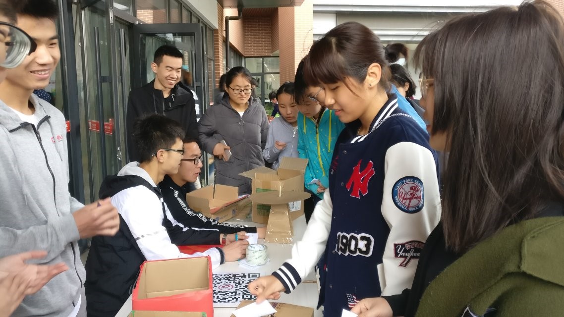 大家一边享受活动,一边汲取知识。有同学在为“中国雾霾最严重的城市”“出现最大臭氧层空洞的国家”这样的问题冥思苦想,有的则为将10个写有不同“垃圾”名称的乒乓球投入正确的垃圾箱中而惊喜欢呼,有人在回答白色事物的时候想到了“冰棍儿”,食堂的几位工作人员也被吸引过来,和同学们一起参与到了活动之中。
