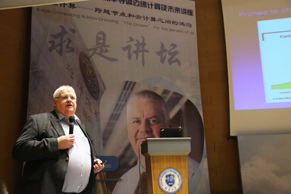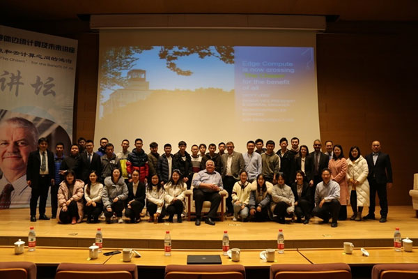 Geoff Lees以金字塔的形式讲解了“边缘计算”的发展和构成,介绍了“边缘计算”在各类智能设备中的应用。其次,他讲解了机器学习在智能家居、噪音检测、姿态控制、智能传感方面的应用,人工智能会对人类生活产生越来越巨大的影响,神经网络正在愈加广泛地运用于边缘计算中。他寄语同学们“You are the Innovators of Tomorrow”,鼓励同学们珍惜青春年华,努力奋斗,拥有促进世界发展的梦想和勇气。演讲结束之后,同学们积极与Geoff Lees交流互动,Geoff Less分享了自己的从业经历和工作习惯,现场气氛活泼热烈。