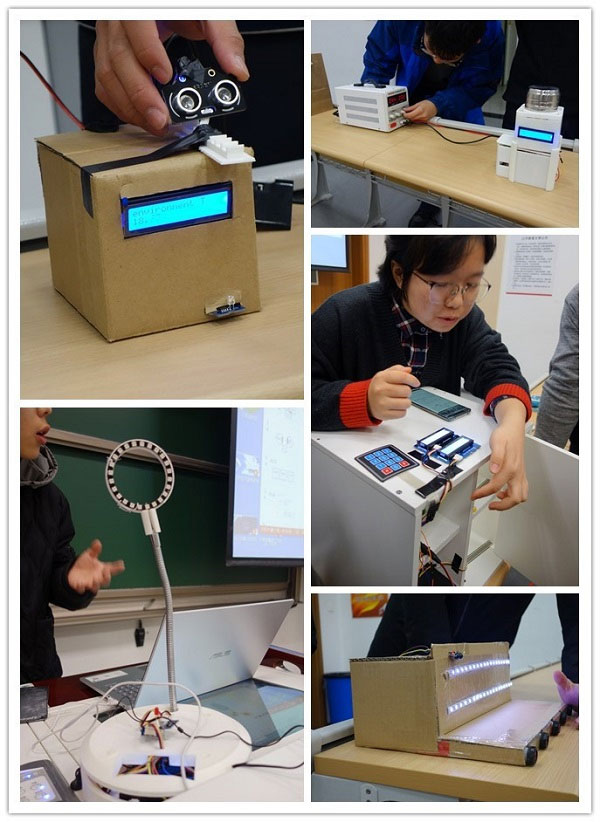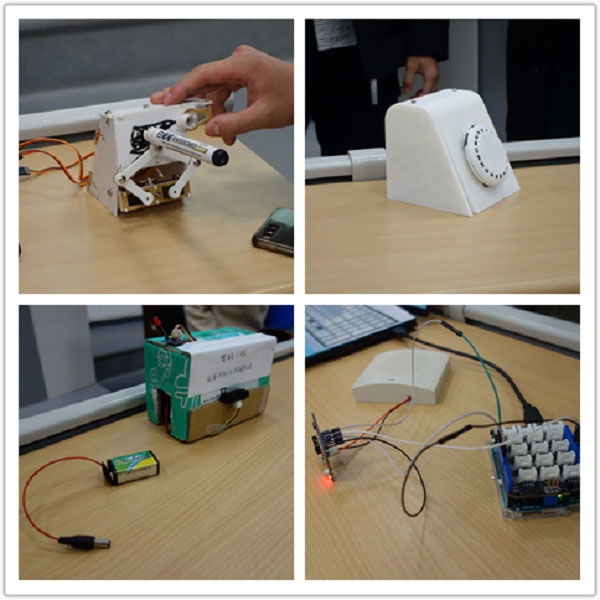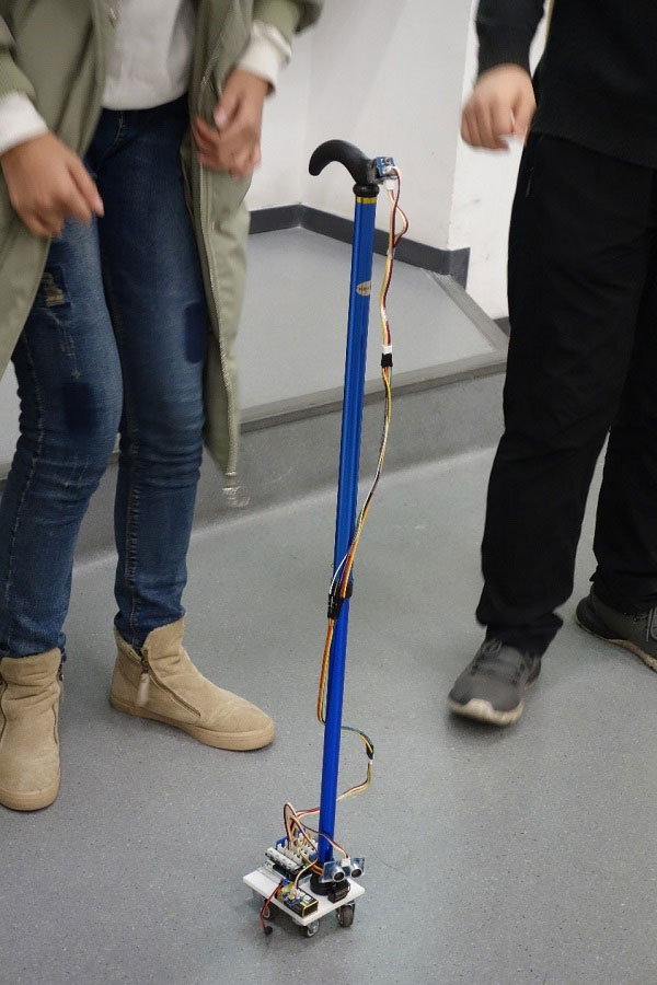 经过前期的设计、制造、组装和试验,所有组的成品皆已具备完整的实际功能。展示分为演讲汇报、实物演示和提问答辩三个环节。同学们的选题从智慧起居到节能出行、从全民大众到助残公益、从便捷医疗到紧急救护,不仅构思巧妙且结合实际,制造出了很多让人眼前一亮的智能装置,吸引评审嘉宾每每起身近距离观摩、尝试操作。其中第3组的“智能导盲手杖”利用超声波传感器探测障碍物,根据距离远近通过手柄震动频率提示主人躲避障碍物,并具有灯光求助功能。不仅设计功能完整,且具有公益性质的社会意义。据组员介绍,下一步将改进手杖的底盘装置,以实现更多地面状况的智能导盲。