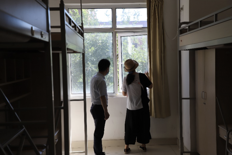 此次实地走访,领导们首先进行了例行检查,对宿舍的消防安全和用电安全给予了高度关注。随后对宿舍的采光、南北朝向、空间大小、卫生情况、基础设施也进行了实地调查。