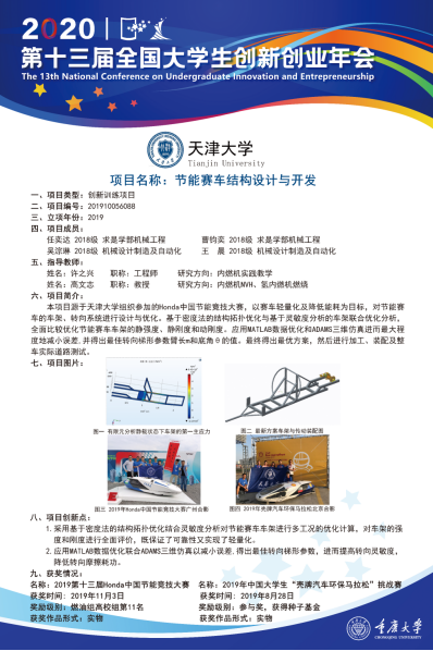 国家级大创项目《节能赛车结构设计与开发》于2019年立项,求是学部2018级本科生任奕达担任项目负责人,求是学部2018级本科生曹钧奕、机械学院2018级本科生吴淙琳、王晨为大创项目成员,机械学院许之兴工程师、高文志教授担任指导教师,历时两年期,稳步推进、不断创新,预计将于2021年结项。