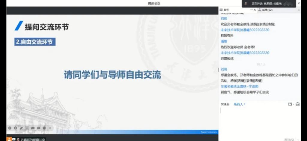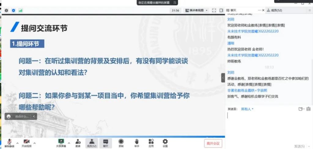与会导师进行了发言,并表达了对同学们进入集训营的祝贺,同时也对自己所擅长的领域进行了介绍,师生之间因此增进了了解。在提问交流环节中,同学们就自己在创新实践中遇到的问题和与会导师们进行了讨论,同学提问踊跃,提到的问题与科创大赛的赛前准备、创新项目的市场竞争力方面有关。其中,郑喆老师对大赛的赛前准备问题进行了全面而系统的解答,金嘉轶老师为同学们解释了项目市场竞争性的相关问题。提问环节过后,参加开幕仪式的同学们对与会导师表达了感谢之情。