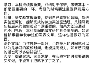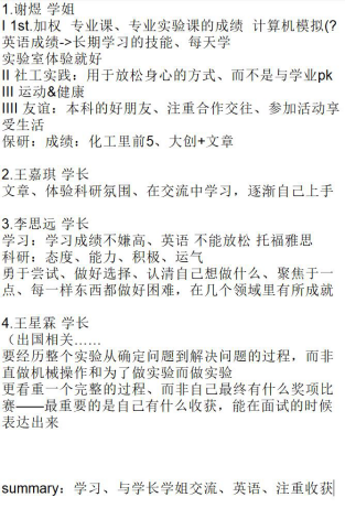 王星霖学长是莱斯大学的在读博士,学长主要介绍了出国方面相关准备,强调了标准化考试及GPA、GRE和托福的成绩,之后强调了推荐信的重要性,并将英语的重要性强调为和GPA同级别。对于科研,要想取得较为满意的成果,要经历整个实验从确定问题经历头脑风暴到解决问题的过程,而非只做机械操作和只是为了做实验而做实验,要有更多自己的想法(解决问题的方法)。无论是在科研方面还是在竞赛方面,都要更加看重这个完整的过程,而非最终自己得到了什么奖项。最重要的是从这个过程中自己收获了什么,这样在将来保研或者出国面试的时候才能表达出来,只有单纯的奖项并无意义,反而会起负面作用。
