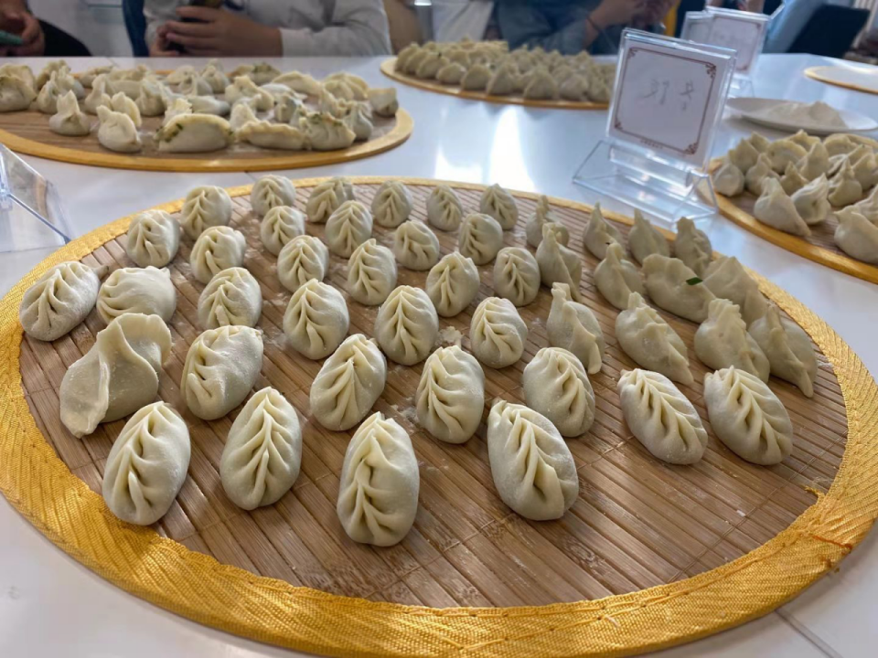 很快,各组都完成了自己的作品,摆在桌子上展示,并由评委点评,最终“干饭组”取得了包饺子冠军的称号。
