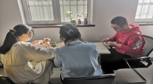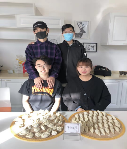 在包饺子环节中,每三到四位同学组成一组,共计五组,大家将自己的组取名为“谢大饺”、“干饭组”、“冬饺”等,风趣又温馨。