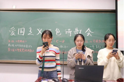 之后就进入了今晚的重头戏——诗歌朗诵环节。该环节由同学们提前报名,自主分组进行朗诵。最终有九组同学参与朗诵活动,诗歌篇目分别为《可爱的中国》、《党旗颂》、《赞美党的诗歌》、《七一》、《七一献诗》、《面对鲜红的党旗》、《党旗飘飘》、《有一首歌》、《庆七一诗歌》。伴随着一首首激昂的音乐和一篇篇雄壮的诗歌,我们仿佛翻开了历史的扉页,看到了过去近百年的艰难曲折与顽强拼搏,一起回到了那段红色的光辉岁月。最终,所有同学民主投票选出了杨珺、孙毅宁、赵心馨三名同学精心挑选的《庆七一诗歌》为第一名。