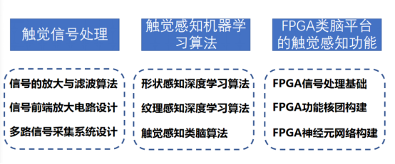 “天津大学触觉获取与再现”项目实战性强,基础点高,已完成了柔性手套与类脑计算平台,并面向天津大学求是学部展示了“触觉信号处理”、“无人机无人车协同校园巡查治安状况,追踪可疑分子”和“FPGA类脑平台的触觉感知功能基本要求:FPGA信号处理基础,FPGA功能核团构建,FPGA神经元网络构建”这样三个开放性项目。