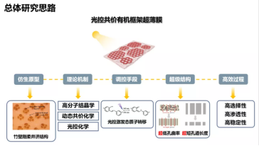 该项目是受竹壁刚柔结构启发,基于高分子结晶学,动态共价化学,光控化学原理,以光控激发态质子转移为调控手段,解决COFs膜材料超低孔曲率,超短孔道长度难以耦合的关键科学问题,实现薄膜的高选择性、高渗透性、高稳定性。目前小组发现随光照时间的延长,膜的截留性能明显上升。截留分子量和透过分子量差值低至300 Da,为目前文献报道的最低值,可实现高效的分子分离。小组下一步计划探究在紫外光下,反应单体聚合成非晶态体型高分子的机理;定量分析COFs膜晶态/非晶态区的占比与有机溶剂纳滤性能、膜机械性能构效关系解析;测试COFs膜在不同操作压力、长周期运行时的稳定性。