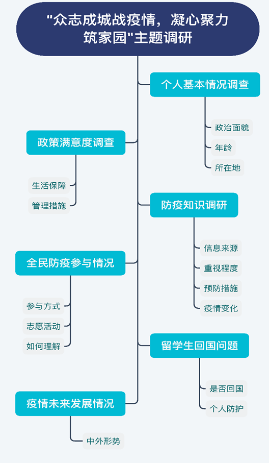 为深入了解广大群众在此次疫情以及相关防疫工作开展过程中的生活、思想情况,实践队结合疫情始末以及大众普遍关心的问题,制作了由18个相互独立或相互关联的基础及热点问题组成的“众志成城战疫情,凝心聚力筑家园”主题问卷。
