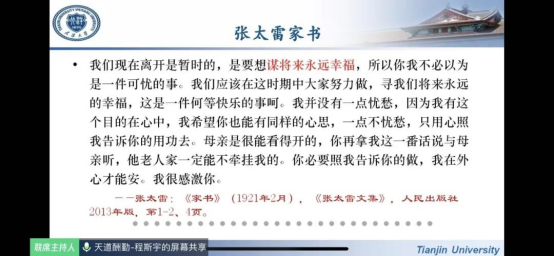 讲座一共持续约100分钟,同学们都听得十分专注,也有很深的感触。有的同学在笔记中写到:张太雷的精神深深鼓舞着我,作为一个新时代的青年,我们要继承革命先烈的夙愿,就如同天津大学的校歌唱的那样,“不从纸上逞空谈,要实地把中华改造”的伟大志向。我们要以此为前进的目标和方向,太雷不死,太雷精神永存。新时代的发展或许不比革命时期血雨腥风,但我们依旧要继承伟人的衣钵,我们不能忘记那句“为谋将来永远幸福”,不能忘记无数革命先烈的无畏探索与牺牲,我们要保持坚定的信仰,下得苦功夫,求得真学问。拥有宽广的视野,开阔的眼界,同时又顾全大局,勇于开拓,敢于斗争。而作为一名发展对象,更要发挥和担当起青年人的先锋作用。我不仅学到了“不忘初心、牢记使命”的坚定信仰和忠实行动,更会在以后的学习生活中,更加坚定着新时代中国青年的伟大理想。严格地要求自己,敢为人先地奋斗,提升自我,奉献自我。