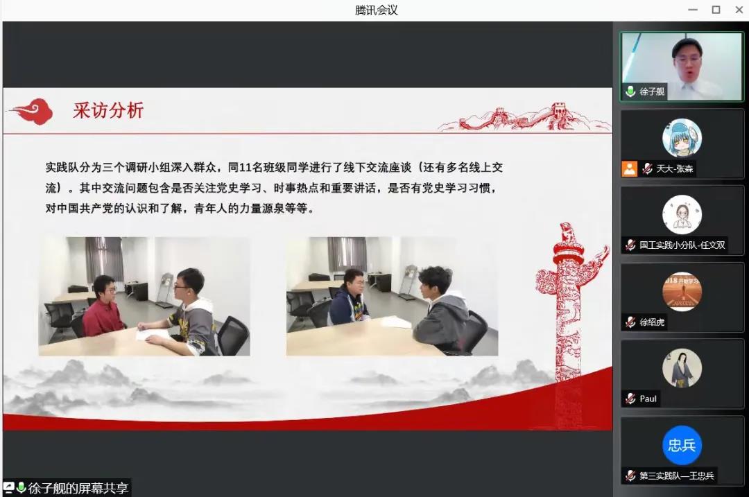 不忘初心实践队以“红船启航迎百年,党旗照耀铸辉煌”为主题,进行了“建党百年调查问卷分析”和线下交流座谈。