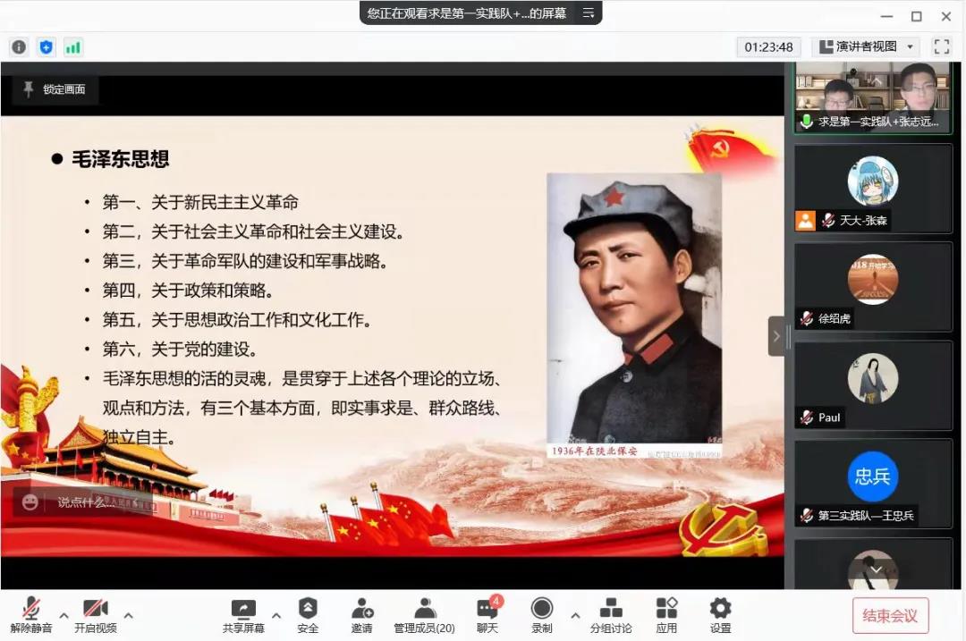 求是学部第一实践队以“百年初心历久弥坚——庆祝中国共产党成立100周年”为主题制作了微党课,就党的行动指南进行讲解,即针对毛泽东思想、邓小平理论、“三个代表”重要思想、科学发展观及习近平新时代中国特色社会主义思想进行展开,在较短的时间内,用较短的篇幅,宣讲党的理论。