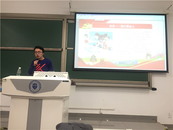 在《做好扶贫这件天大的事》理论宣讲环节,预备党员培训求是学部第三实践队党员杨幂、周骁分别从“扶贫——国家在行动”、“扶贫——天大在行动”和“扶贫——我们要行动”三个方面讲解了国家、天大和个人层次的作为。“我国贫困人口今年累计减少8239万人,贫困发生率从10%降低至1.7%。天大对定点扶贫的宕昌进行教育扶贫,智力扶贫,消费扶贫和产业扶贫,体现了天大对宕昌的‘造血式扶贫’。”杨幂提到。