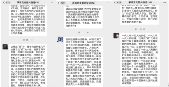结合“全国大学生共上一堂疫情防控思政大课”,王俊生同志说:“我们的制度优势,组织动员能力在这次灾难中发挥的淋漓尽致,所有人都有目共睹。与其他国家相比,我们的中国特色社会主义制度优势得到了极大的体现。青年一代在这次疫情中起到了中流砥柱的作用,90后00后们向全国人民证明了年轻人的担当和能力。这次战疫之后,我对我们的制度更加充满信心,对跟着党走的态度更加坚定,对于我们民族的复兴更有希望。”