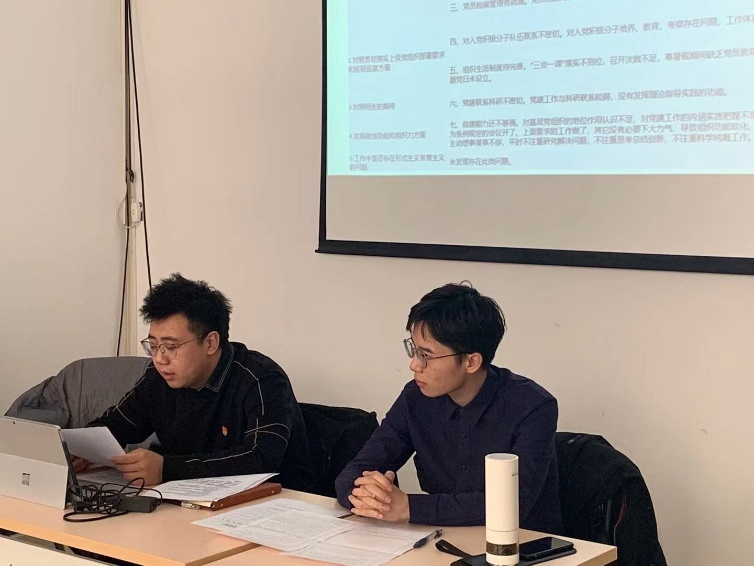 之后蔡响前同志在会上通报了与宣传委员刘岳同志和组织委员杨雨人同志通过对照党章、《中国共产党支部工作条例(试行)》、高校基层党组织工作条例、上级党组织部署要求和巡视巡察方面、师生的期待以及发挥政治功能和组织力方面所发现的问题清单。蔡响前同志表示通过对照查摆问题,发现当前支部存在宣传工作不到位、理论学习不完善、党员档案管理有疏漏、对入党积极分子队伍联系不密切、组织生活制度待完善、党建联系科研不密切、自建能力还不够强等七个主要问题,并向支部同志汇报了支委准备的整改计划。针对支部存在的问题,大家也进行了针对性的讨论,结合讨论情况,蔡响前同志也在会上制定了相应的整改措施及整改完成时限。之后,全部党员进行投票,对支委会过去一年的工作进行了民主测评。